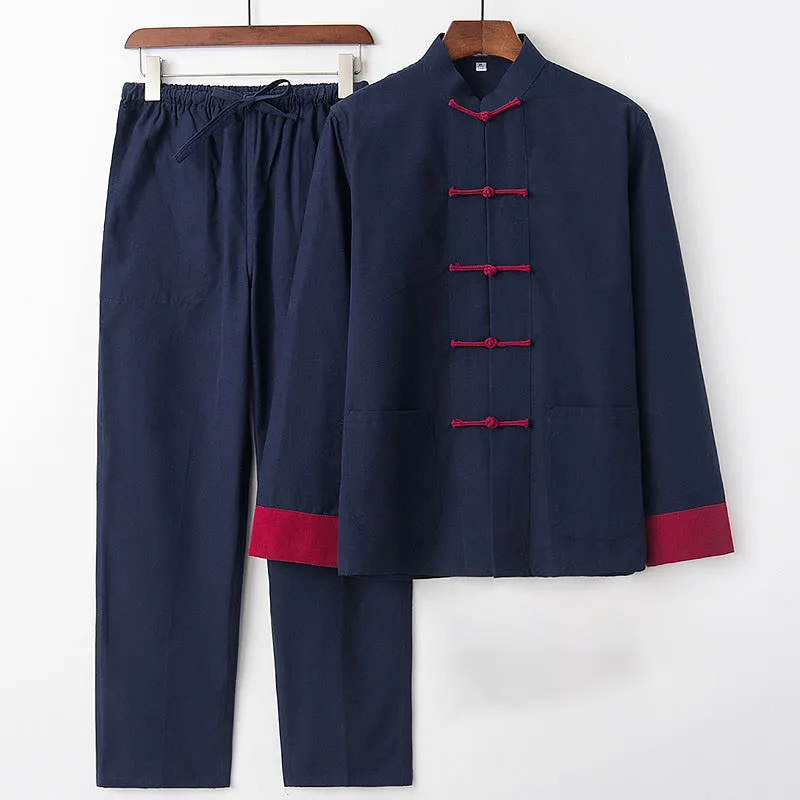 Mythstone 2Pcs Fall Men’s Tang Suit Frog-Button Cotton Long Sleeve Shirt Pants Set