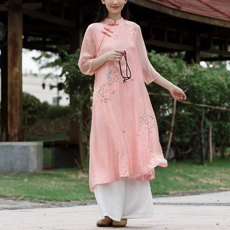 Mythstone 2Pcs Frog-Button Long Sleeve Shirt Top Pants Meditation Zen Tai Chi Cotton Linen Clothing Women’s Set